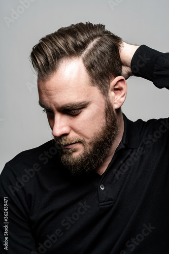 head, shoulder, hand, away, haircut, barber, hairdresser, model, male, man, man, person, people, hair, brown, beard, elegant, clean, caucasian, european, photogenic, attractive, style, fashionable, trendy, pleased, happy, at ease, appearance, profile, striking, bachelor, unattached, formal, gorgeous, attitude, thoughtful, serious, humor, adult, pose, after work, easy, informal, alone, modern, tough, sexy, grey
