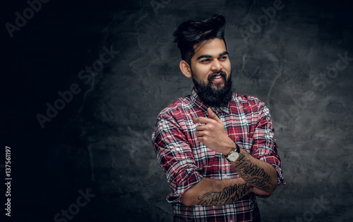 A handsome bearded Indian male dressed in a fleece shirt.