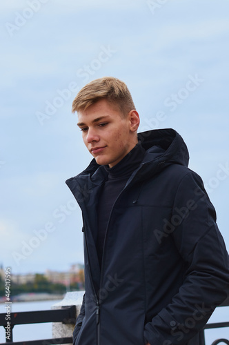 blond, city, guy, photogenic, portrait, male, jacket, man, person, caucasian, urban, young, acne, adult, fashion, model, posing, river, attractive, casual attire, lifestyle, looking, 1, embankment, fence, promenade, bask, blonde hair, people, leather, health, clothes, white, move, laugh, outside, russia, face, modern, style, cold, pocket, love, step