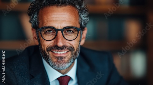 A handsome businessman with glasses, beard, and a confident smile. He is dressed in a suit, exuding professionalism and warmth in an elegant setting.