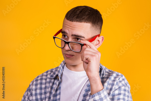 young, background, man, male, casual attire, person, portrait, photogenic, guy, adult, isolated, shirt, face, yellow, fashion, expression, looking, goggles, attractive, model, studio, people, idea, european, look, teenage, chequered, clothing, orange, school, feeling, 1, creativity, concept, thinking, copy space, american, advertising, cool, modern, white, lifestyle, baby boomer, yellow background, trend, student, standing