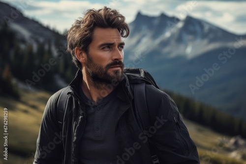 a handsome man hiking in the mountains, feeling liberated and adventurous as he takes in the breathtaking views of the natural world
