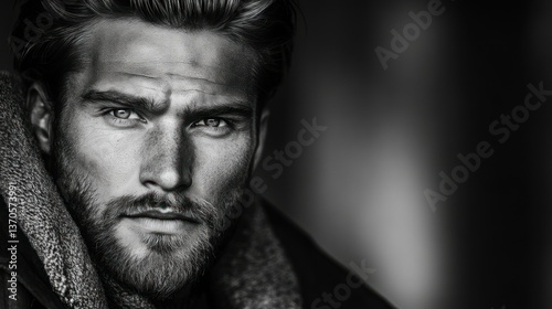 portrait, male, face, eye, beard, hair, skin, fur, clothing, detail, close, shadow, light, expression, photogenic, serious, young, mature, adult, looking, forward, eyebrow, forehead, lip, jaw, cheek, nose, chin, neck, shoulder, texture, contrast, black, white, greyscale, studio, photo, artistic, gaze, intense, strength, confident, sharpened, symmetry, vertical, side