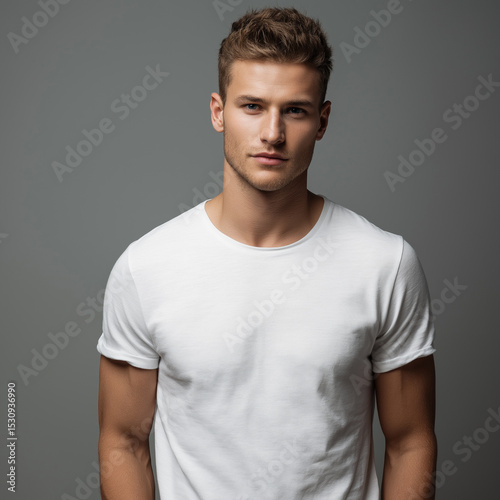 A handsome young man in a plain white t-shirt poses against a neutral gray background. His clean-cut look, toned build, and confident expression convey modern style and simplicity.