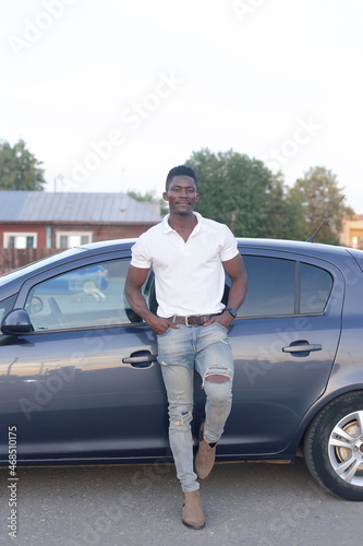 A happy African-American man near a car. Car sales and rentals