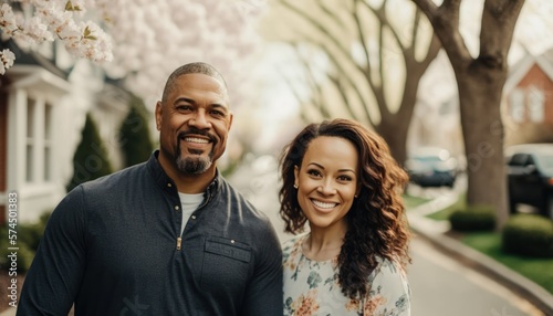 A Happy and Joyful Multiracial Couple in Tree-Lined Streets in Beautiful, Romantic and Cheerful Spring: A Celebration of Happiness, Nature's Beauty, and Love (generative AI