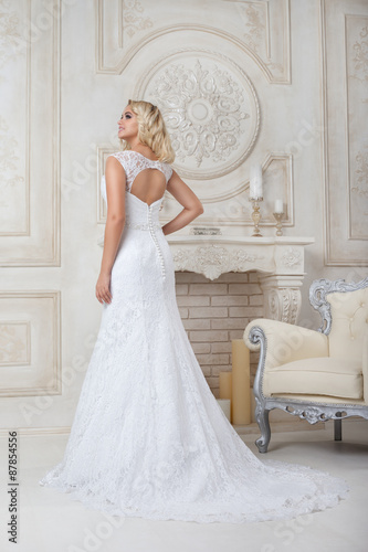 woman, youth, happiness, wedding, bride, beauty, dress, white, blond, celebration, groom, girl, 1, smile, innocence, tenderness, tender, love, fireplace, portrait, chair, room, fashion, engagement, ceremony