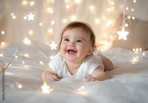 A happy baby girl lies on her back in the white bed, smiling and playing with fairy lights