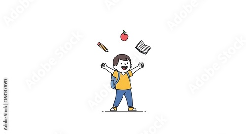 A happy boy with a backpack ready for school with an apple book and pencil floating above him