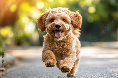 dog, brown, happy, running, toward, camera, pet, canino, animal, fur, paw, tail, tongue, teeth, smile, playful, cute, adorable, portrait, outside, park, nature, green, grass, blur, bokeh, sunlight, shadow, path, street, pavement, motion, speed, fast, movement, joy, excitement, energy
