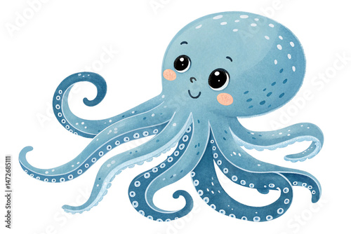 octopus, cartoon, illustration, digital artwork, cute, animal, marin, sea, ocean, underwater, invertebrate, mollusc, tentacle, eye, smiling, happy, friendly, marine animal, ocean life, wildlife, nature, drawing, clip art, vector, simple, stylised, blue, light blue, white, pink, isolated, white background, character, design, graphic, art, children, playful, whimsical, adorable, soft, gentle, innocent, colours, mammal
