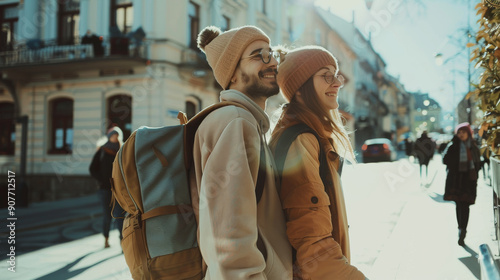 couple, winter, sunny, street, walk, cosy, happy, city, urban, outdoors, day, smile, love, travel, adventure, cold, destination, sightseeing, human relationships, leisure, fun, building, casual attire, hat, architecture, friends, youthful, urban life, companionship, tour tourism, lifestyle, warmth, pedestrian, path, sunlight, vacation, wanderlust, beanie, journey, sidewalk, enjoyment, stroll, streetlife, backpack, casual clothes, scenic, lively