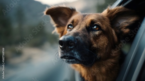 dog, car, window, wind, road, trip, adventure, animal, pet, canino, mammal, fur, eye, ear, portrait, closeup, head, brown, black, loyal, companion, travel, journey, vehicle, outdoors, outside, motion, movement, breeze, traveling, nature, landscape, scenic, blurred, background, tree, mountain, wild, freedom, happiness, joy, excitement, curiosity, alert, looking, ahead, enjoyment, leisure, lifestyle