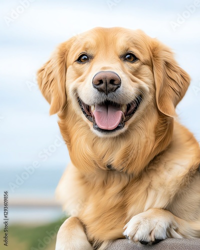 A happy dog with its head out of a car window, surrounded by a scenic coastal road and soft pastel skies