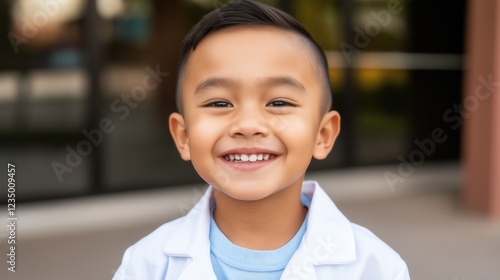 A happy East Asian boy in a medical coat smiles outside a healthcare facility on Doctors Day