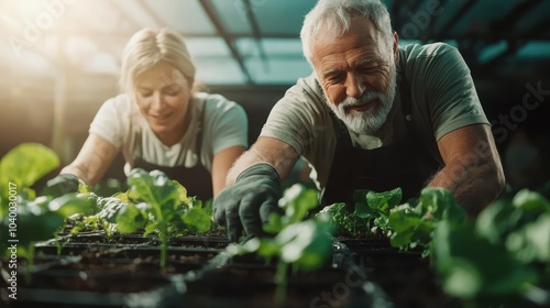 A happy elderly couple invests time in gardening inside a greenhouse, cultivating plants with attentiveness, symbolizing joy and partnership in their golden years.