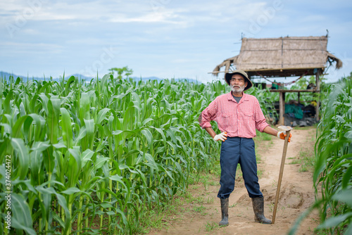 A happy elderly man who is a senior farmer standing with a hoe and walking in the corn field.