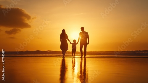 A happy family walks together on the beach during a beautiful sunset, creating lasting memories in a serene environment.