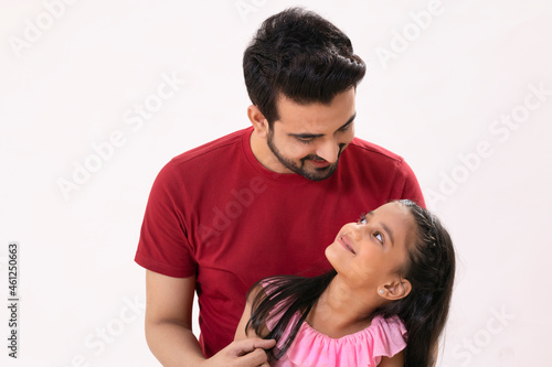 father, daughter, indian, happy, standing, loving, care, affection, smiling, cheerful, enthusiastic, togetherness, family, love, urban, india, casual clothes, red, t-shirt, pink, top, exhilaration, excited, guardian, protective, satisfied, fulfillment, girl, enjoyment, posing, real people, white background, front view, adult, children, asian, horizontal, half-length, studio