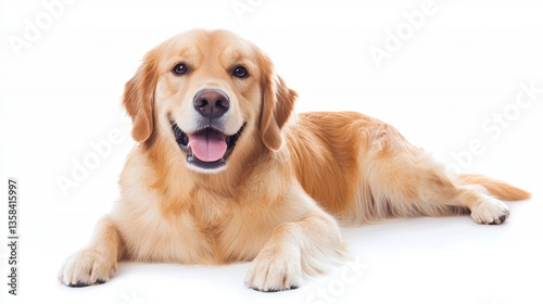 A happy golden retriever lying down with a cheerful expression, showcasing its soft fur and friendly demeanor.