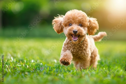 A happy light brown poodle puppy runs playfully towards the camera in a beautiful green field.