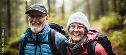 A happy man and woman wearing outerwear and hats are smiling for the camera while hiking in a natural landscape with trees, grass, and plants