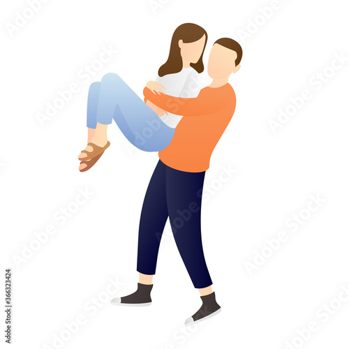 a happy man carrying and embracing woman in arms. couple cartoon characters. romantic couple relationship in flat vector illustration.