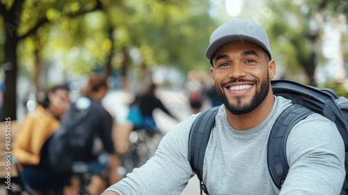 A happy man wearing a gray cap and backpack enjoys a bike ride in a sun-dappled park, smiling broadly as he pedals along the leafy path with others.