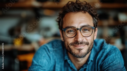 A happy man wearing glasses relaxes in a stylish workspace, exuding contentment and focus, highlighting a balance between comfort and professionalism.