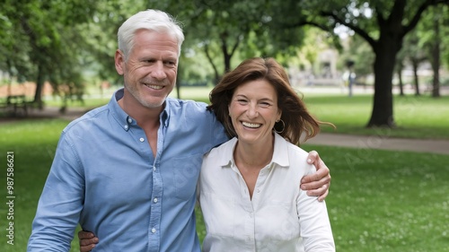 A happy mature couple walking in the park, smiling and enjoying each other's company, bonding during their outdoor leisure time in nature