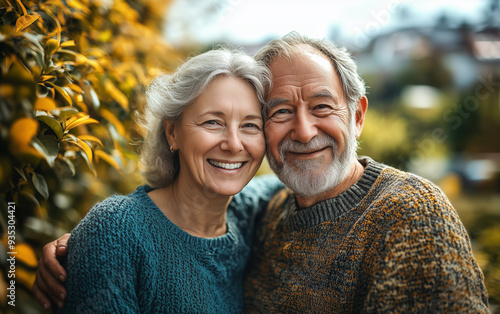 A happy senior couple, smiling and embracing outdoors, share a tender moment in a portrait shot.