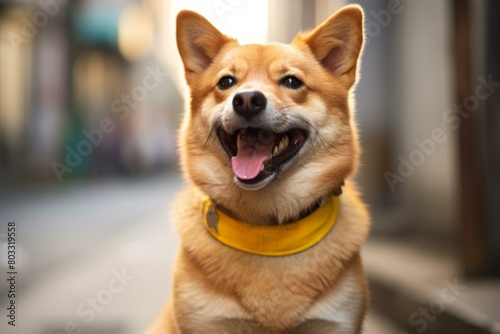 A happy Shiba Inu dog wearing a yellow collar is sitting on the street and looking at the camera