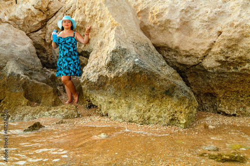 A happy woman in a blue sundress and a straw hat stands on the rocks with a cocktail in her hand.