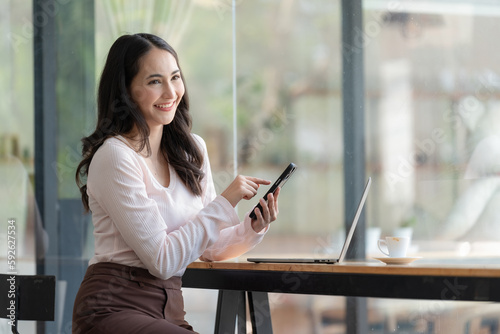 A happy young Asian woman talking on her mobile phone and smiling while sitting at her working place in a cafe.
