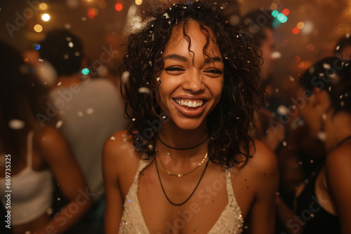 A happy young woman smiling brightly, surrounded by colorful confetti during a festive celebration.
