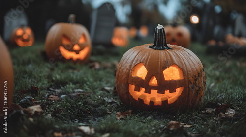 A haunted cemetery with carved pumpkins.