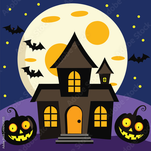 A haunted house with glowing jack-o'-lanterns on the porch, bats flying across the full moon in the background.