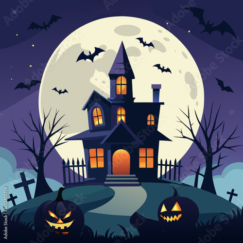A haunting Halloween background featuring a spooky haunted house, glowing pumpkins, and flying bats