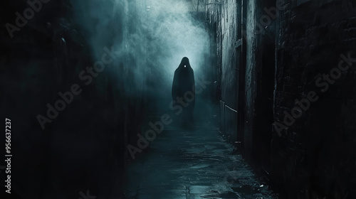 A haunting scene of a dark alley with a ghostly figure faintly visible at the end, enveloped in dense fog.
