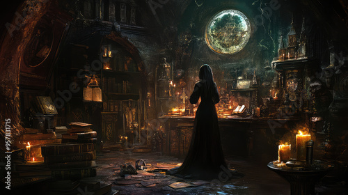 A haunting scene of a witch amidst a collection of ancient spell books and artifacts, bathed in the soft glow of candlelight.