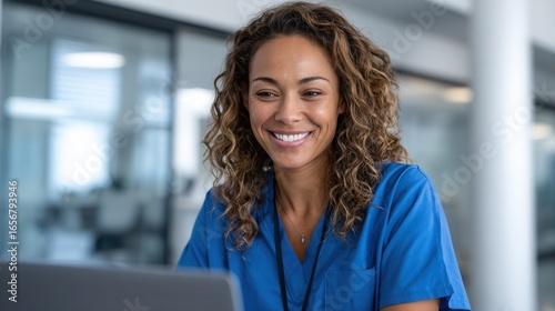health care, professional, smile, laptop, office, modern, blue, scrub, woman, work, happy, technology, communication, teamwork, medicine, wellness, support, care, portrait, casual attire, confident, focused, service, patient, environment, interior, workspace, doctor, nurse, medicals, health, career, success, business, education, research, consultation, information, digital, lifestyle, motivation, innovation, efficiency