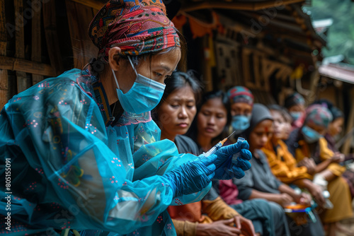 A healthcare worker administering vaccines in a remote village, combating preventable diseases and promoting public health. Concept of global health initiatives. Generative Ai.