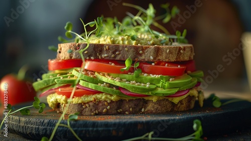 A healthy veggie sandwich stacked with avocado, tomato, sesame seeds, and microgreens.