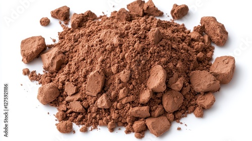 A heap of delicious dark chocolate powder ready for baking and culinary uses, displayed on a crisp white background