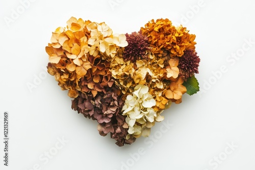A heart crafted from colorful flowers rests on a pristine white surface, symbolizing love and romance.
