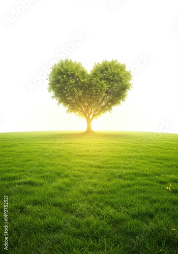 A heart-shaped tree in a lush green field under a bright sky, a symbol of love and nature