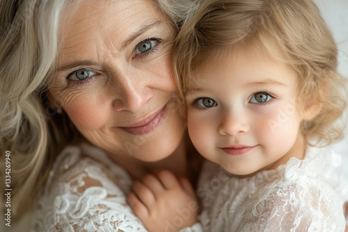 grandmother, granddaughter, love, affection, family, bond, closeup, portrait, tender, heartwarming, senior, children, girl, toddler, woman, elderly, hug, hugs, togetherness, happy, joy, connection, human relationships, generation, kinship, care, precious, sweet, innocent, beautiful, eye, smile, white dress, lace, gentle, warmth, serene, peaceful