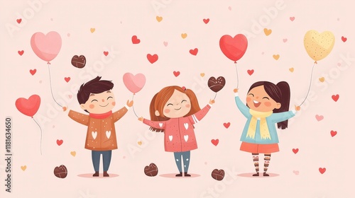 A heartwarming flat vector of children in colorful outfits, surrounded by heart-shaped balloons and chocolates on a pastel pink background.