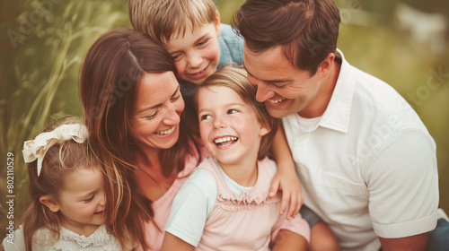 A heartwarming photo captures a happy family, consisting of a mother, father, and two children, smiling warmly at the camera, radiating love and joy in their togetherness