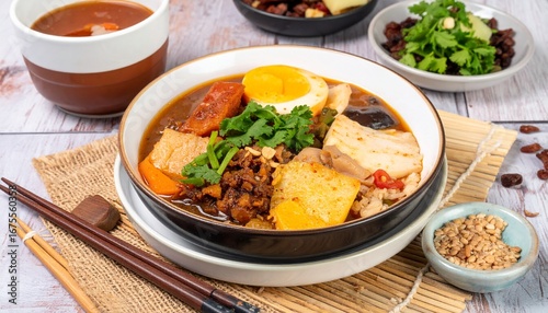 A hearty and savory traditional Taiwanese comfort food bowl with braised pork, soy egg, tofu, and fresh vegetables on a rustic table setting